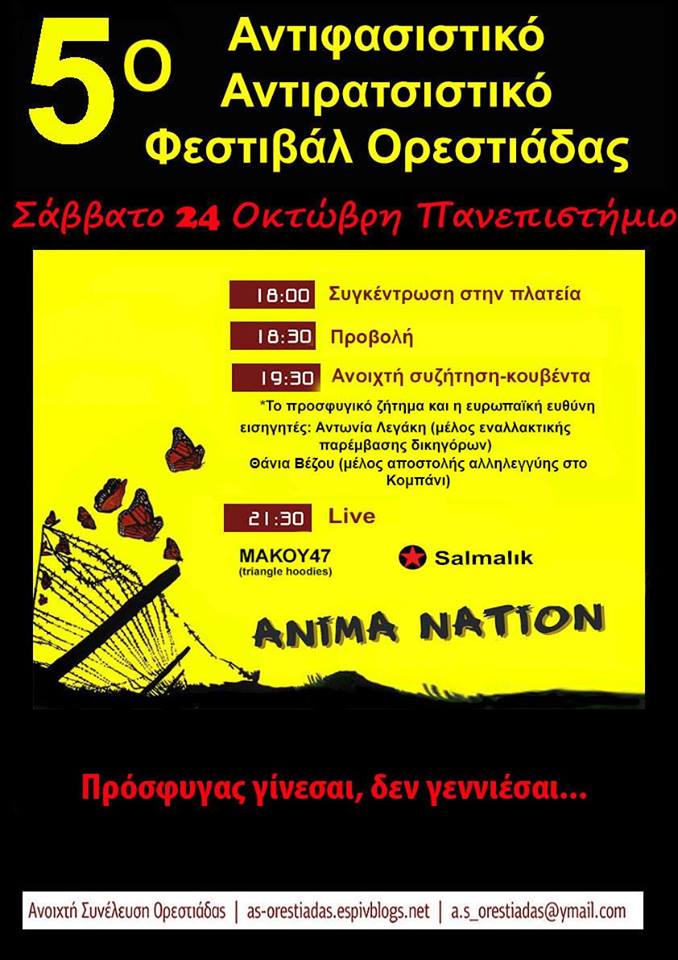 Μετά από 5 χρόνια συνεχούς παρουσίας στον κοινό αγώνα ενάντια στο ρατσισμό και στο φασισμό, η Ανοιχτή Συνέλευση Ορεστιάδας διοργανώνει το 5ο Αντιρατσιστικό – Αντιφασιστικό φεστιβάλ στην πόλη. Στο επίκεντρο αυτή τη φορά το προσφυγικό ζήτημα και η στάση της Ευρώπης αλλά και της Ελλάδας ως πύλη εισόδου σε αυτήν.