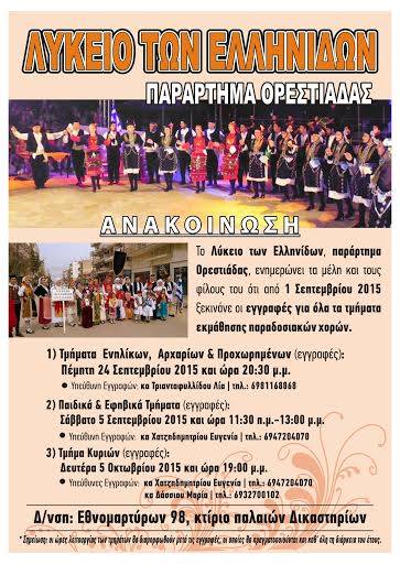 Το Λύκειο των Ελληνίδων Ορεστιάδας συνεχίζοντας για ακόμα μία χρονιά την ανάδειξη και την διάδοση του Ελληνικού πολιτισμού δημιουργεί τα εξής τμήματα εκμάθησης παραδοσιακών χορών για την διδακτική χρονιά 2015-2016.
