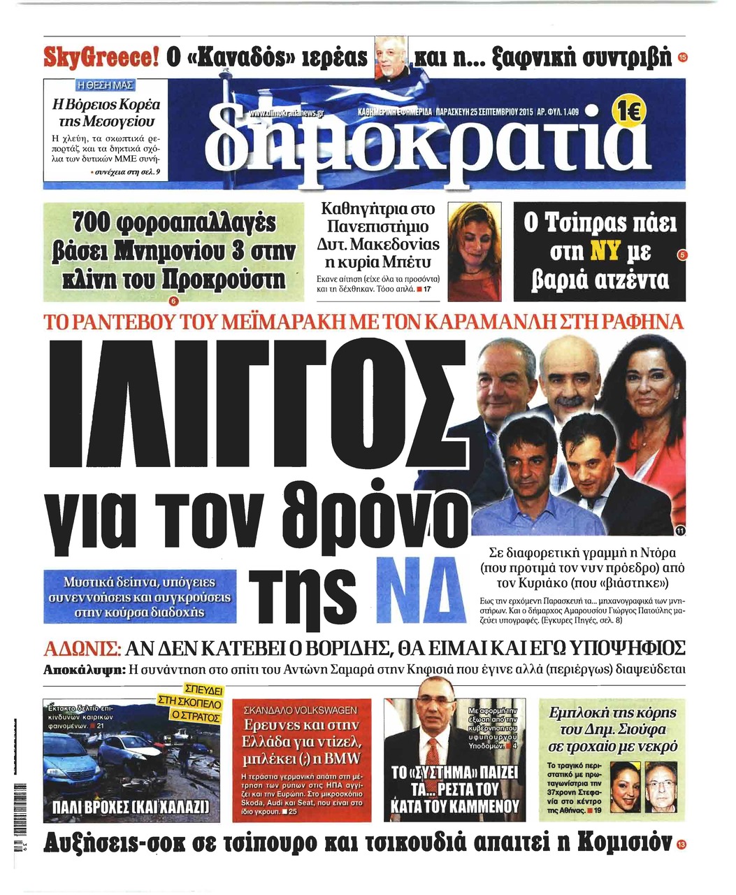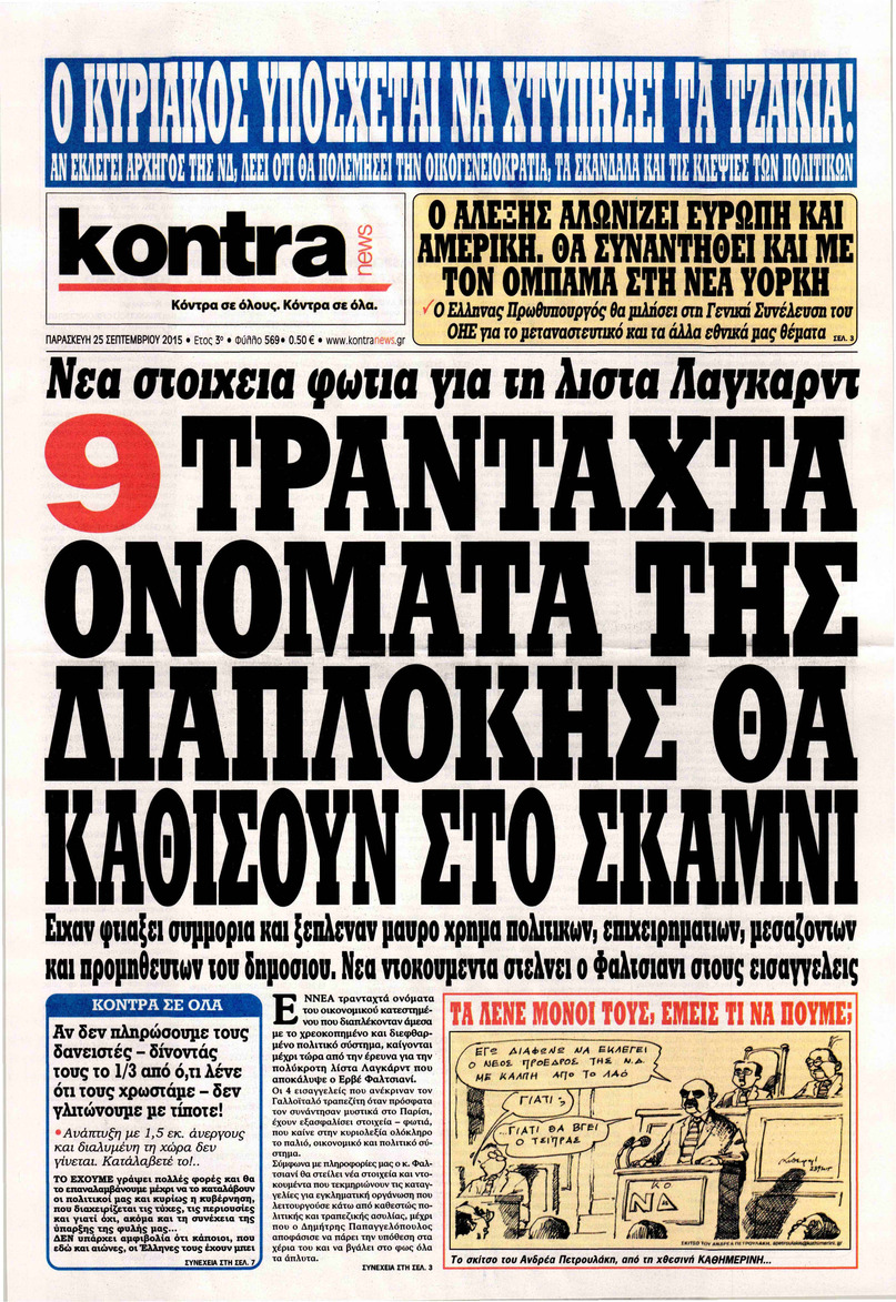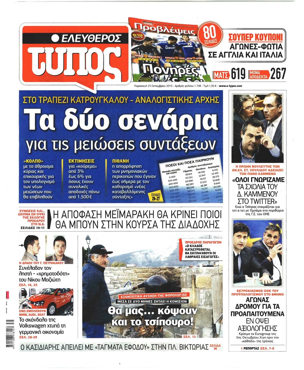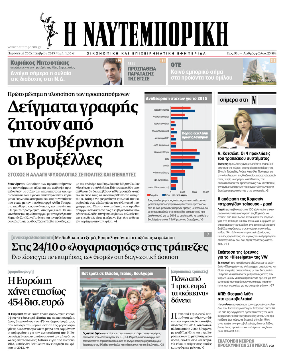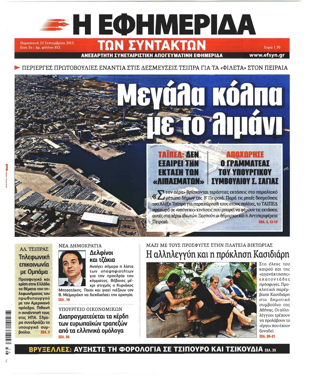 Πρωτοσέλιδα του ελληνικού Τύπου 25/09/2015