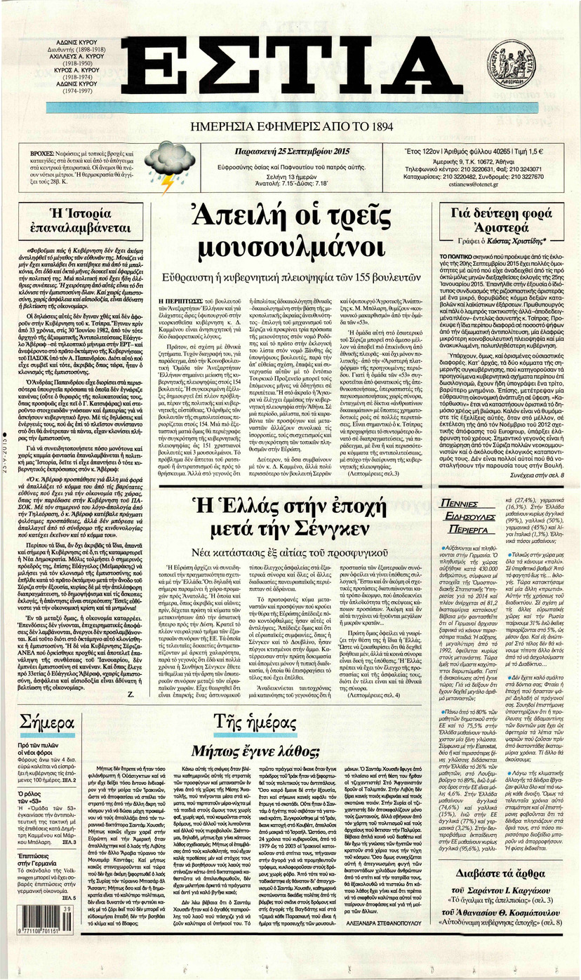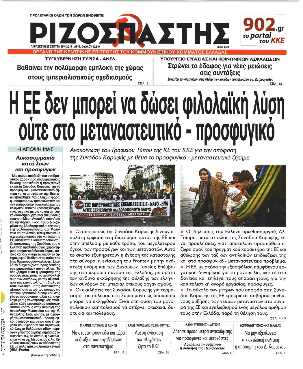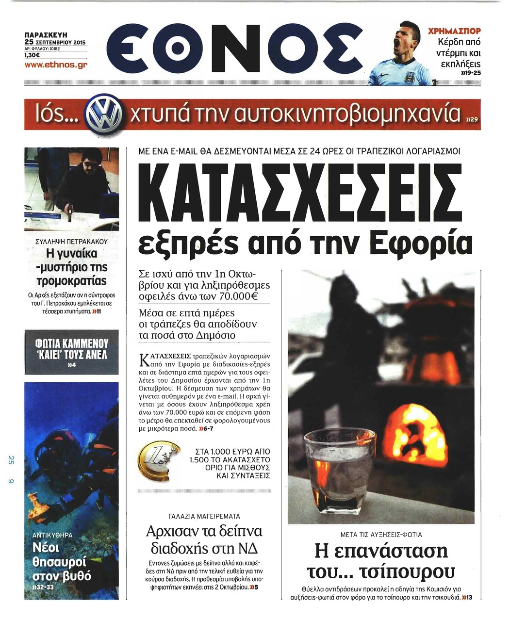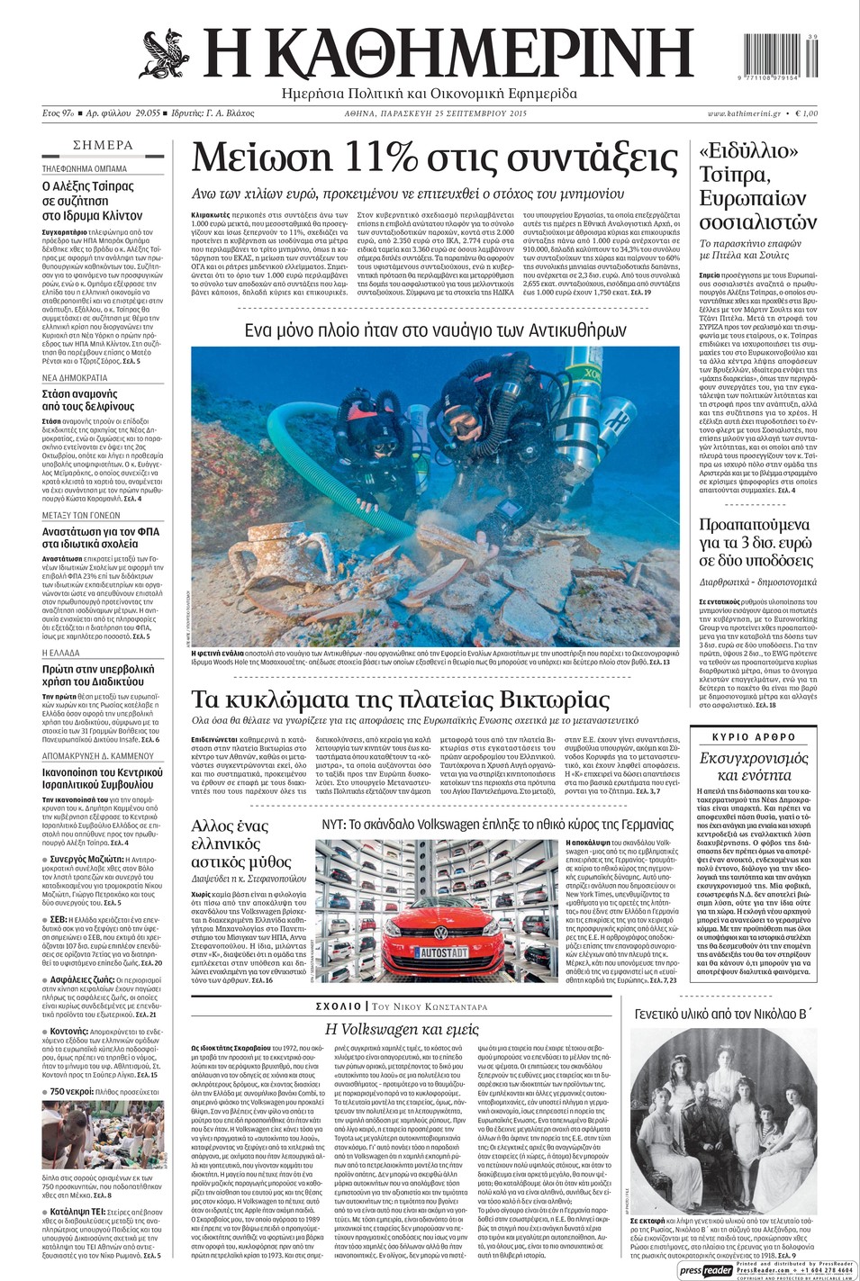 Πρωτοσέλιδα του ελληνικού Τύπου 25/09/2015
