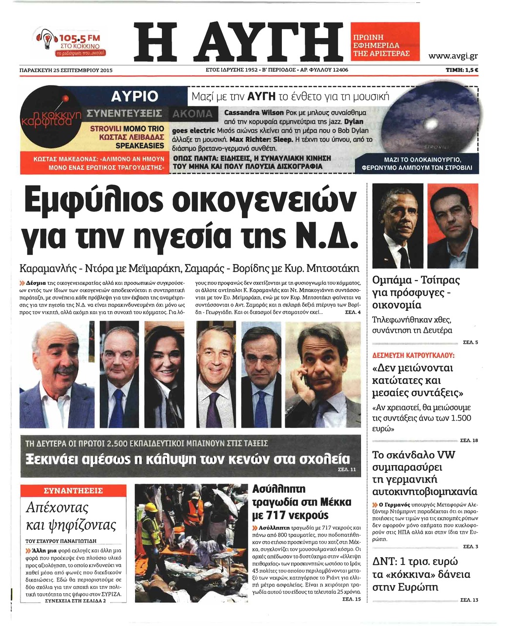 Η ΑΥΓΗ: «Εμφύλιος οικογενειών για την ηγεσία της Ν.Δ.»
