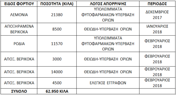 63 τόνοι φορτίων με λεμόνια, ρόδια και αποξηραμένα βερίκοκα δεσμεύτηκαν και απορρίφθηκαν στο Τελωνείο των Κήπων από τον Δεκέμβριο του 2017 μέχρι τον Φεβρουάριο του 2018