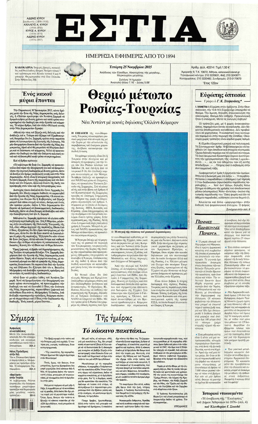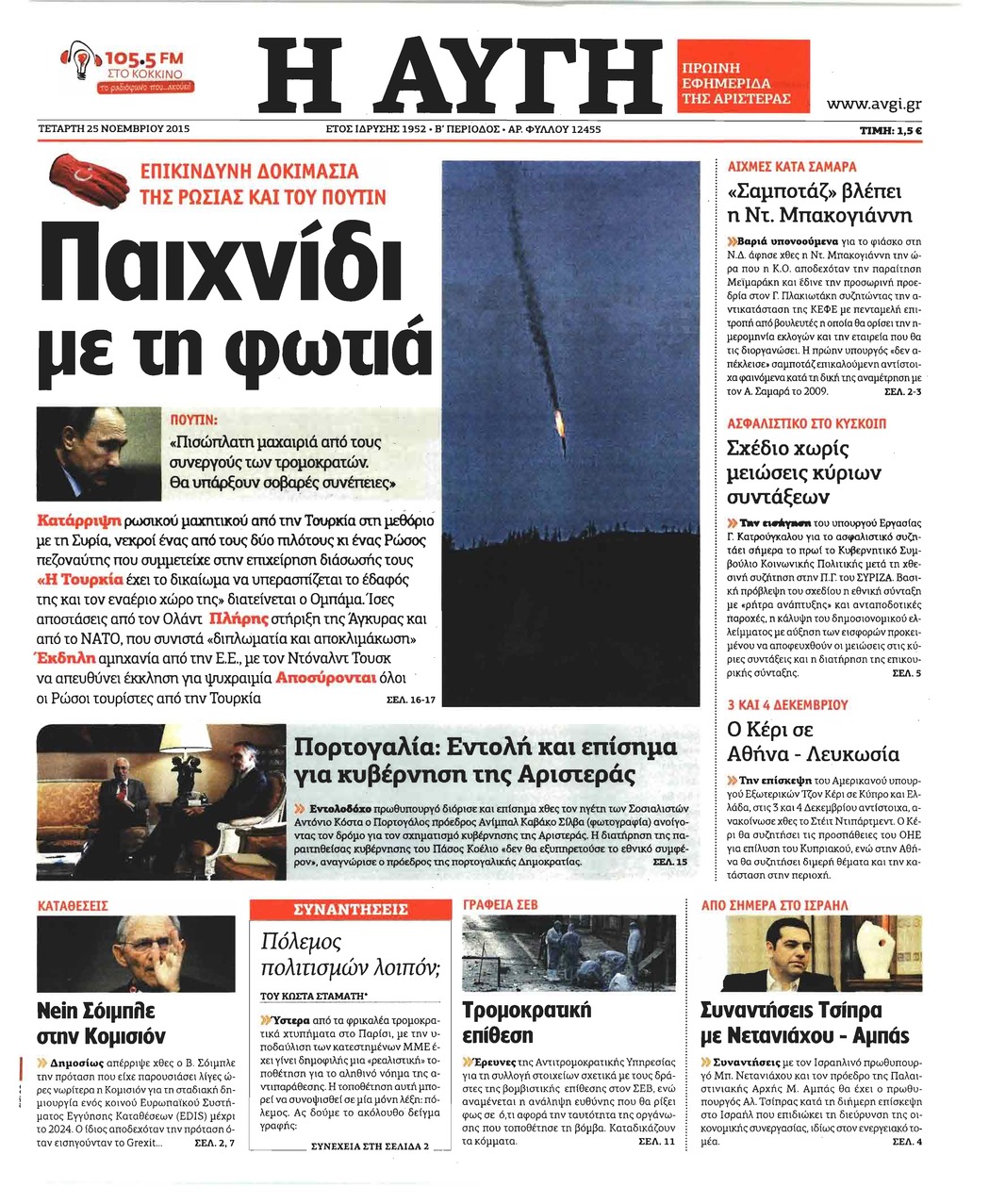 Η εφημερίδα γράφει ότι “Επικίνδυνη τροπή λαμβάνει ο πόλεμος κατά των τζιχαντιστών στη Συρία μετά την κατάρριψη ρωσικού μαχητικού SU-24 από δυο τουρκικά πολεμικά αεροσκάφη στη μεθόριο με την Τουρκία”.