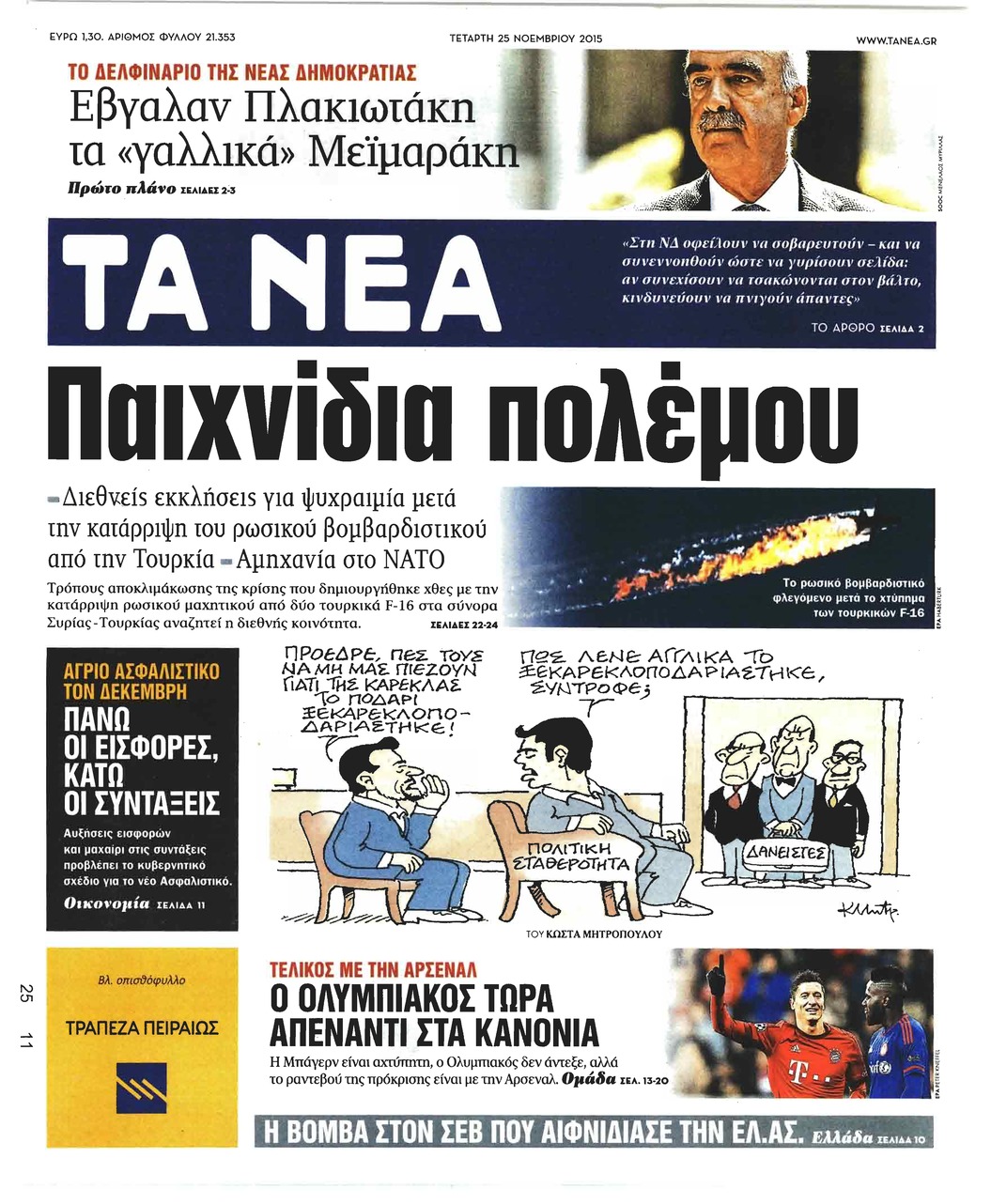 ΤΑ ΝΕΑ: “Παιχνίδια πολέμου. Διεθνείς εκκλήσεις για ψυχραιμία μετά την κατάρριψη του ρωσικού βομβαρδιστικού από την Τουρκία. Αμηχανία στο ΝΑΤΟ”.