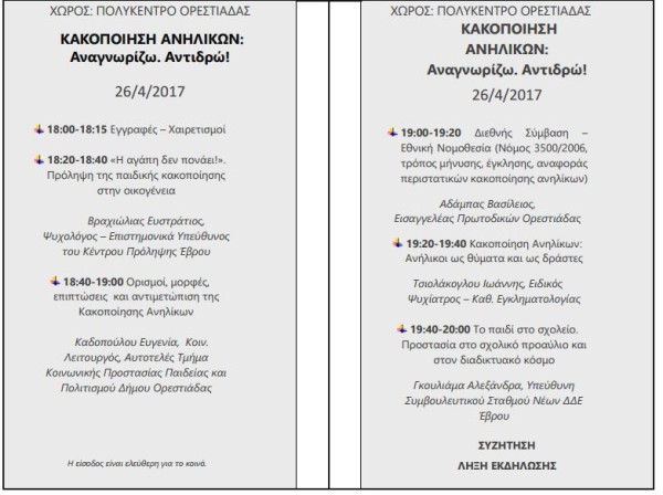 Ημερίδα σχετική με την αναγνώριση – πρόληψη – αντιμετώπιση της κακοποίησης ανηλίκων διοργανώνει η Διεύθυνση Δευτεροβάθμιας Εκπαίδευσης Έβρου, δια της Υπευθύνου του Συμβουλευτικού Σταθμού Νέων, στην Ορεστιάδα.