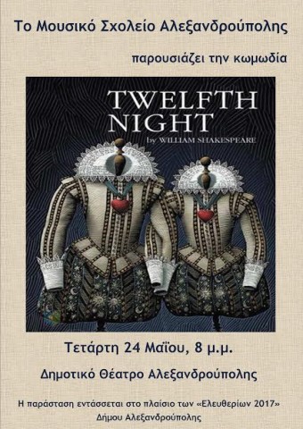 Στα πλαίσια των εορτασμών για τα «Ελευθέρια 2017» του Δήμου Αλεξανδρούπολης το Μουσικό Σχολείο Αλεξανδρούπολης παρουσιάζει την «12η Νύχτα» του Ουΐλλιαμ Σαίξπηρ.
