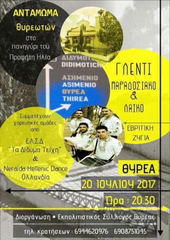 Η Θυρέα σας προσκαλεί στο πανηγύρι του Προφήτη Ηλία, την Πέμπτη 20 Ιουλίου 2017 και ώρα 20:30 με γλέντι παραδοσιακό και λαϊκό με την Εβρίτικη Ζυγιά.