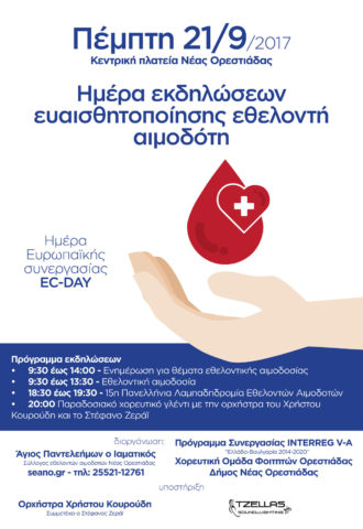 Ο Σύλλογος Εθελοντών Αιμοδοτών Νέας Ορεστιάδας “Άγιος Παντελεήμων ο Ιαματικός”, η Διαχειριστική Αρχή του Προγράμματος Συνεργασίας INTERREG V-Α “Ελλάδα-Βουλγαρία 2014-2020”, η Χορευτική Ομάδα Φοιτητών Ορεστιάδας και ο Δήμος Νέας Ορεστιάδας, στο πλαίσιο της Ημέρας Ευρωπαϊκής Συνεργασίας (EC-DAY),συνδιοργανώνουν,την Πέμπτη 21 Σεπτεμβρίου 2017 την “Ημέρα εκδηλώσεων ευαισθητοποίησης εθελοντή αιμοδότη”