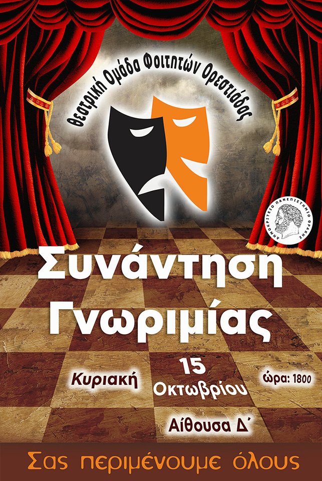 Η Θεατρική Ομάδα Φοιτητών Ορεστιάδας (Θ.Ο.Φ.Ο.) προσκαλεί τα μέλη και τους φίλους της στην έναρξη της θεατρικής χρονιάς η οποία θα γίνει με την επίσημη συνάντηση την Κυριακή 15 Οκτωβρίου 2017 και ώρα 18:00 στην Αίθουσα Δ της Σχολής Επιστημών Γεωπονίας και Δασολογίας του Δ.Π.Θ Ορεστιάδας.