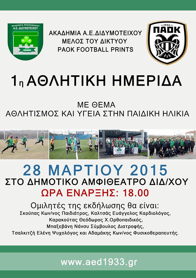 Αθλητική ημερίδα με θέμα “Αθλητισμός και Υγεία στην παιδική ηλικία” διοργανώνει η Ακαδημία της Α.Ε.Διδυμοτείχου το Σάββατο 28/03/2015 και ώρα 18:00 στο Δημοτικό αμφιθέατρο Διδυμοτείχου.Στην ημερίδα θα μιλήσουν επιστήμονες της πόλης και αφορά όλα τα παιδιά αγόρια και κορίτσια αλλά κυρίως απευθύνεται στους γονείς!