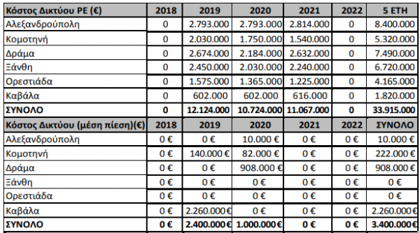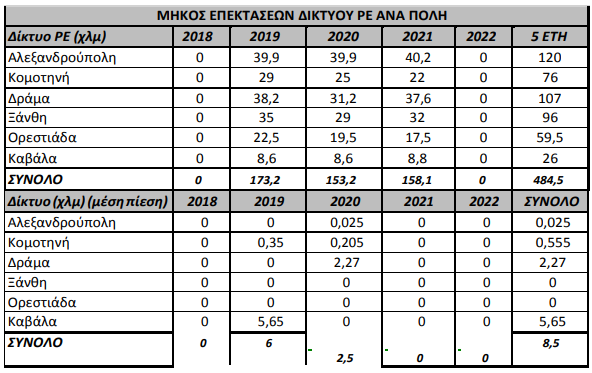 Το μήκος του νέου Δικτύου Διανομής το οποίο πρόκειται να εγκατασταθεί στις περιοχές στην Ανατολική Μακεδονία και Θράκη, αποτυπώνεται στον ακόλουθο πίνακα: