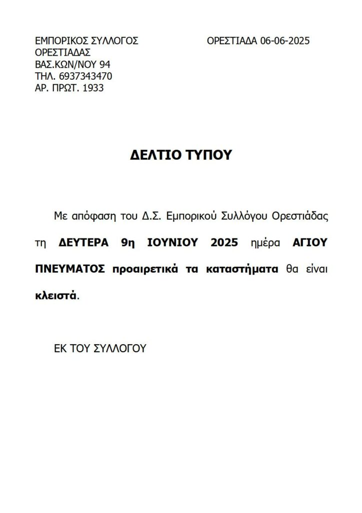 Στην λιτή ανακοίνωση αναφέρεται πως την ημέρα του Αγίου Πνεύματος προαιρετικά τα καταστήματα θα είναι κλειστά: