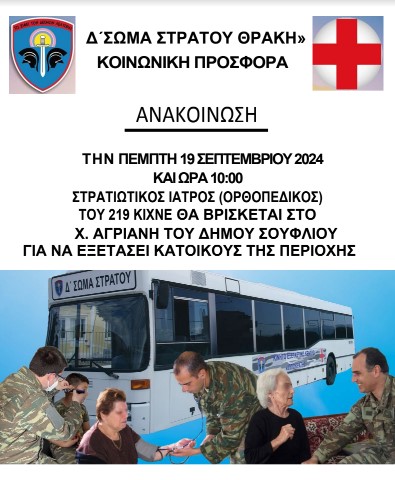 Στο πλαίσιο του προγράμματος κοινωνικής προσφοράς των Ενόπλων Δυνάμεων, στρατιωτικός ιατρός (ορθοπεδικός) του 219 ΚΙΧΝΕ θα βρίσκεται την Πέμπτη 19 Σεπτεμβρίου 2024 στις 10:00 στο χωριό Αγριάνη του Δήμου Σουφλίου για να εξετάσει κατοίκους της περιοχής.