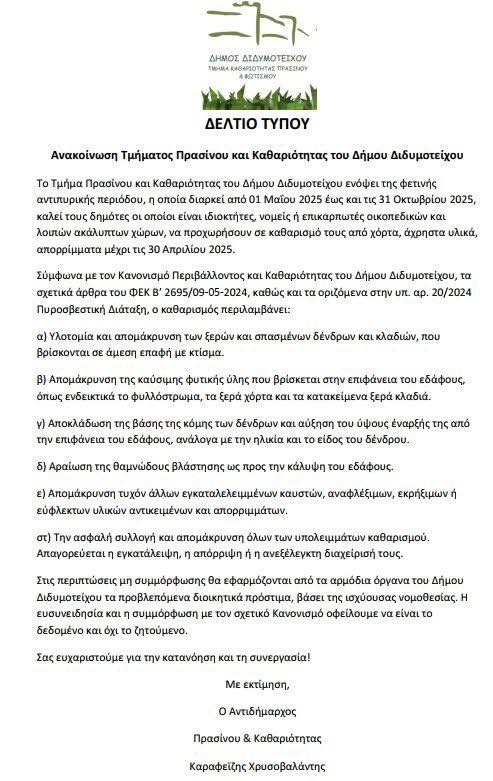 Όπως ανακοίνωσε το υπουργείο Κλιματικής Κρίσης και Πολιτικής Προστασίας, με αφορμή την έναρξη της αντιπυρικής περιόδου για το έτος 2025 , οι ιδιοκτήτες ή νομείς επικαρπωτές και μισθωτές οικοπέδων και λοιπόν ακάλυπτων χώρων ιδιοκτησίας τους έχουν την υποχρέωση καθαρισμού από σήμερα μέχρι και την 30ή Απριλίου του 2025 σύμφωνα με τις διατάξεις της 20/2024 Πυροσβεστικής Διάταξης (Β΄2695) προς αποτροπή κινδύνου πρόκλησης πυρκαγιάς ή ταχείας επέκτασής της.