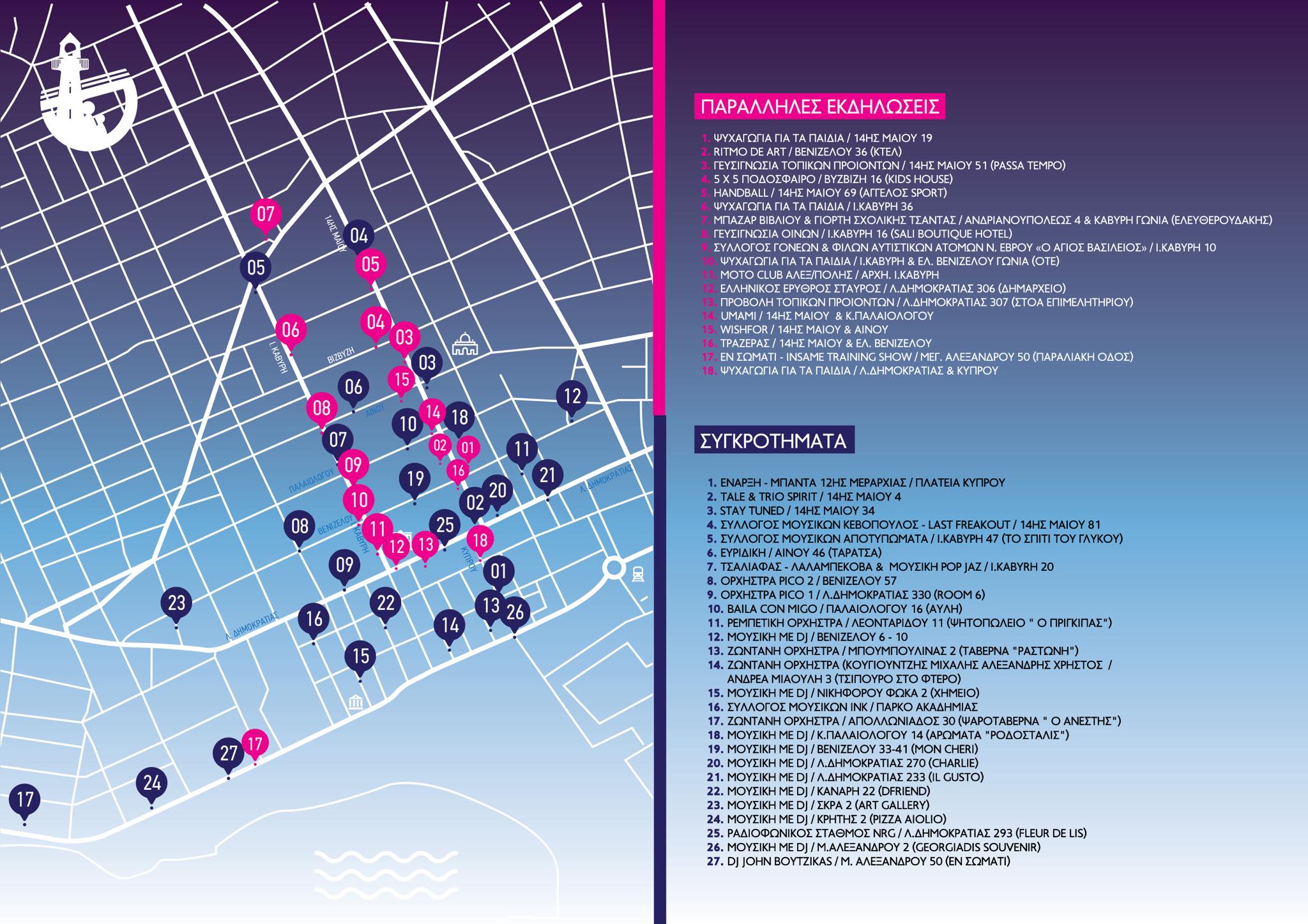 Φέτος θα στηθούν 17 σκηνές στο κέντρο της Αλεξανδρούπολης, με καλλιτεχνικό πρόγραμμα καθώς και ακόμη 10 spots με DJs που θα δίνουν ρυθμό στη νύχτα! Αλλά και παράλληλες εκδηλώσεις για παιδιά, χορευτικά σχήματα, handball και 5Χ5 θα υπάρχουν σε διάφορα σημεία της πόλης. Αναλυτικά τα σημεία με τις εκδηλώσεις: