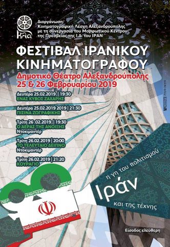 Ημέρες Ιρανικού Κινηματογράφου φιλοξενεί, για πρώτη φορά η Κινηματογραφική Λέσχη Αλεξανδρούπολης στις 25 και 26 Φεβρουαρίου 2019, προσφέροντας μια σπάνια ευκαιρία στους κινηματογραφόφιλους της πόλης να γνωρίσουν καλύτερα τον σύγχρονο κινηματογράφο του Ιράν.