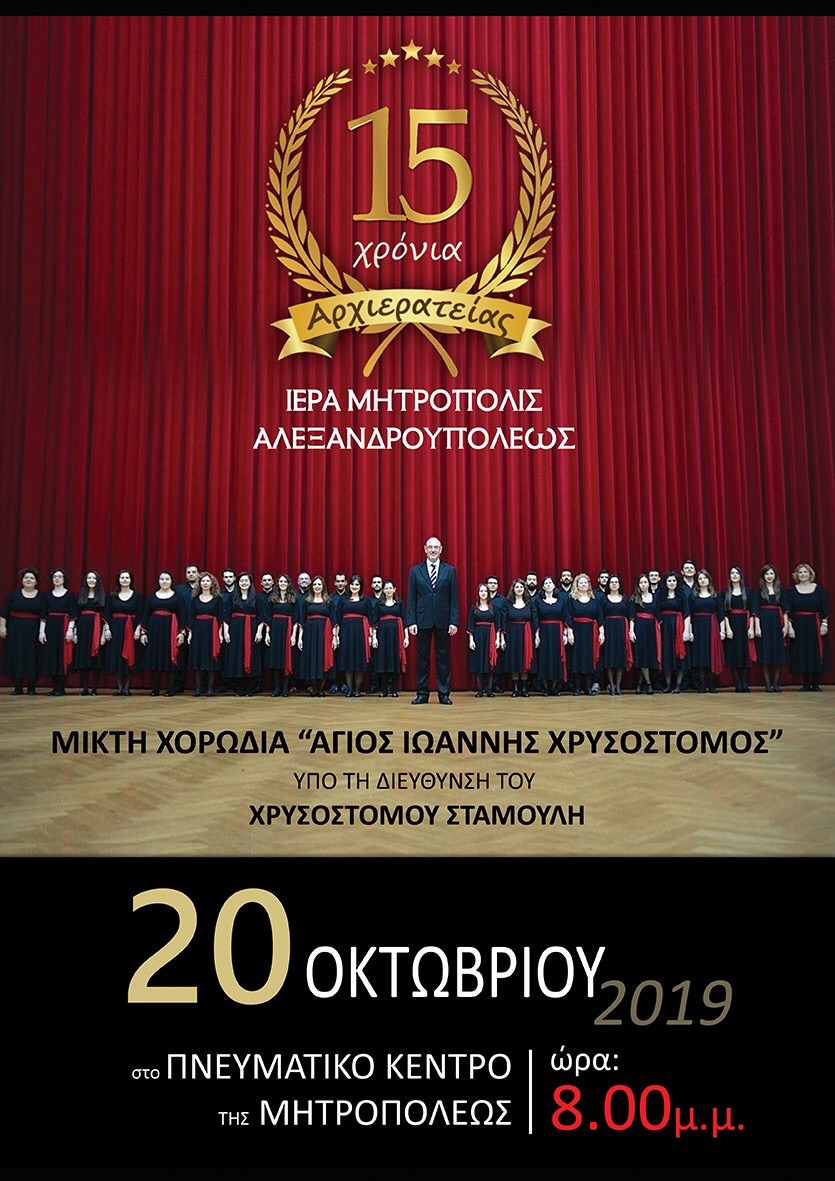 20.00΄: Μουσική Συναυλία στο Πνευματικό Κέντρο της Ιεράς Μητροπόλεως αφιερωμένη στα 15 χρόνια Αρχιερατείας του Σεβ. Μητροπολίτου μας με την διεθνούς φήμης Μεικτή Χορωδία «Άγιος Ιωάννης ο Χρυσόστομος» από την Θεσσαλονίκη, υπό την διεύθυνση του κ. Χρυσοστόμου Σταμούλη, καθηγητού Θεολογίας του Δ.Π.Θ.