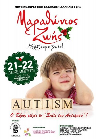 Η «Ένωση Πολιτιστικών Φορέων Έβρου» (ΕΠΟΦΕ) διοργανώνει και φέτος για 4η χρονιά τη φιλανθρωπική μουσικοχορευτική χορωδιακή εκδήλωση ‘‘Μαραθώνιος Ζωής’’ στις 21 Δεκεμβρίου (χορωδίες, μουσικά σχήματα, μουσικά σύνολα, μπάντες, ωδεία, μεμονωμένοι ερμηνευτές) και 22 Δεκεμβρίου (χορευτικά σχήματα, μεμονωμένοι ερμηνευτές) 2019 και ώρες 18:00-22:00 (και τις δυο ημερομηνίες) στο Δημοτικό Θέατρο Αλεξανδρούπολης, σε συνδιοργάνωση με τον αρμόδιο Σύλλογο Γονέων & Φίλων Αυτιστικών Ατόμων Νομού Έβρου «Ο Άγιος Βασίλειος».