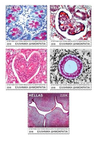 Πέντε τέτοιες απεικονίσεις μέσα από το μικροσκόπιο της Αναπληρώτριας Καθηγήτριας Ιστολογίας-Εμβρυολογίας στο Τμήμα Ιατρικής του Δημοκρίτειου Πανεπιστημίου Θράκης κυρίας Λαμπροπούλου Μαρίας, αποτυπώνονται στην Αναμνηστική Σειρά Γραμματοσήμων «Επιστήμη και Τέχνη μέσα από το μικροσκόπιο», φανερώνοντας ότι η μαγεία της τέχνης μπορεί να κρύβεται παντού. Ακόμα και μέσα στις μικροσκοπικές εικόνες που περνούν καθημερινά από τα μάτια της και δημιουργούν ασύλληπτα σχήματα και παραστάσεις, μεταλλάσσοντας την ψυχρή Ιατρική Επιστήμη σε Τέχνη, επισημαίνοντας παράλληλα ότι, παρόλο που αποτελούν δύο ασύμβατες έννοιες, ο σωστός συνδυασμός τους αποδεικνύεται μεγαλειώδης, ιδιαίτερα όταν προκύπτει μέσα από το μικροσκόπιο.