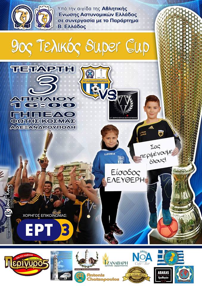 Η Αλεξανδρούπολη διοργανώνει για δεύτερη συνεχόμενη χρονιά το Super Cup της Αθλητικής Ένωσης Αστυνομίας και όπως και την προηγούμενη χρονιά η ομάδα του Α.Τ. Αλεξανδρούπολης “FC Police Alexandroupolis” η οποία κατέκτησε τον τίτλο του πρωταθλητή Βορείου Ελλάδας θα διεκδικήσει στην έδρα της τον τίτλο του πρωταθλητή Ελλάδας.