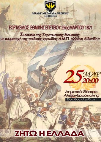 Η ΧΙΙ Μηχανοκίνητη Μεραρχία Πεζικού «ΕΒΡΟΥ» στο πλαίσιο του εορτασμού της Εθνικής Επετείου της «25ης Μαρτίου 1821», διοργανώνει συναυλία με τη συμμετοχή της Στρατιωτικής Μουσικής και της Παιδικής Χορωδίας του Αρχείου Μουσικολαογραφικής Παράδοσης «Χρόνης Αηδονίδης».