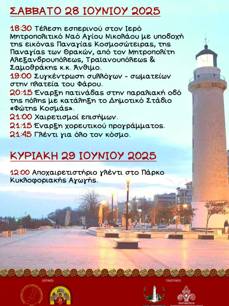 28 – 29 Ιουνίου 2025: η Θράκη ανταμώνει ξανά! Η καρδιά της παράδοσης θα χτυπήσει δυνατά στην Αλεξανδρούπολη, εκεί όπου ο πολιτισμός, η μουσική, ο χορός και η ψυχή της Θράκης θα ενωθούν σε μια μοναδική γιορτή μνήμης και συνέχειας.
