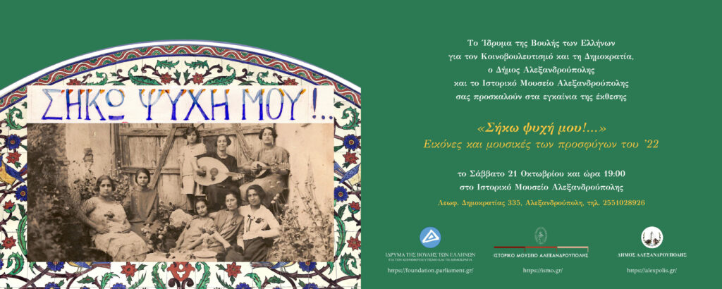 - Έκθεση με τίτλο «ΣΗΚΩ ΨΥΧΗ ΜΟΥ»!… Εικόνες και μουσικές των προσφύγων του ᾽22» στα πλαίσια των εκδηλώσεων μνήμης για τη Μικρασιατική Καταστροφή