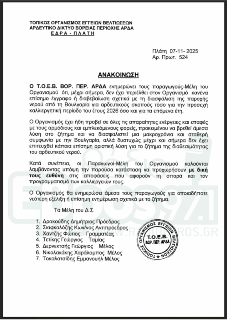 Ο Τ.Ο.Ε.Β. ΒΟΡ. ΠΕΡ. ΑΡΔΑ ενημερώνει τους παραγωγούς-Μέλη του Οργανισμού ότι, μέχρι σήμερα, δεν έχει περιέλθει στον Οργανισμό κανένα επίσημο έγγραφο ή διαβεβαίωση σχετικά με τη διασφάλιση της παροχής νερού από τη Βουλγαρία για αρδευτικούς σκοπούς τόσο για την προσεχή καλλιεργητική περίοδο του έτους 2026 όσο και για τα επόμενα έτη.