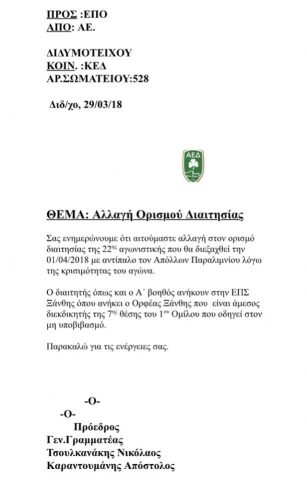 Δημοσιεύουμε την από 29/3 αίτηση της ομάδας προς την ΕΠΟ (υπ´όψιν ΚΕΔ ) για την αλλαγή διαιτησίας για τον σημερινό αγώνα.