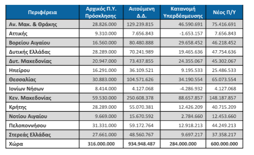 Έτσι οριστικοποιήθηκε η κατανομή των πόρων ανά Περιφέρεια, όπως αποτυπώνεται στον παρακάτω πίνακα, συνεκτιμώντας παράγοντες που άπτονται: