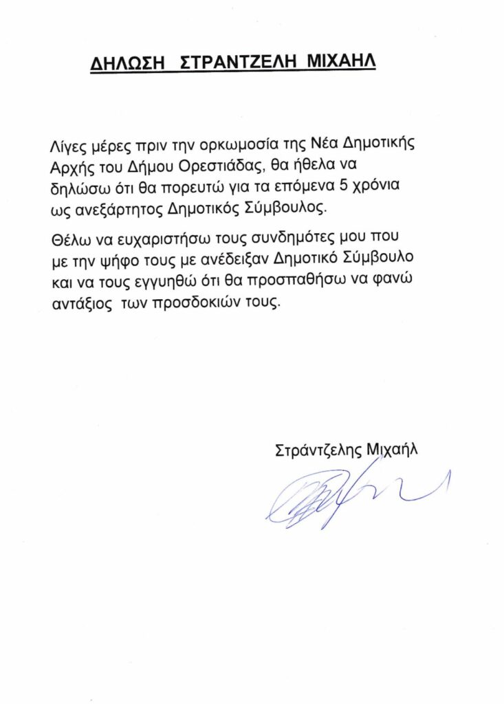 “Λίγες ημέρες πριν την ορκομωσία της Νέας Δημοτικής Αρχής του Δήμου Ορεστιάδας, θα ήθελα να δηλώσω ότι θα πορευτώ για τα επόμενα 5 χρόνια ως ανεξάρτητος Δημοτικός Σύμβουλος.