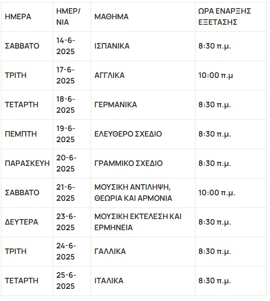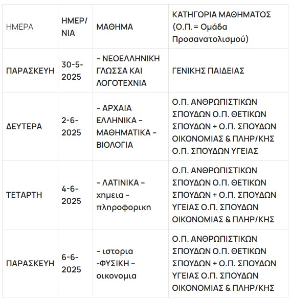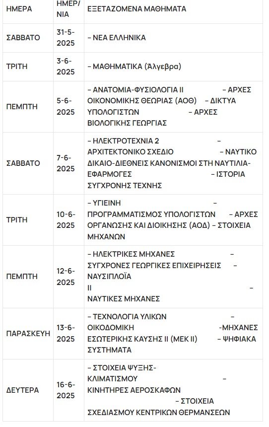 Ανακοινώθηκε το πρόγραμμα Πανελλαδικών Εξετάσεων ημερήσιων και εσπερινών ΓΕΛ και ΕΠΑΛ, Ειδικών και Μουσικών μαθημάτων και η προθεσμία Υγειονομικής Εξέτασης και Πρακτικής Δοκιμασίας των υποψηφίων για εισαγωγή στα ΤΕΦΑΑ, έτους 2025