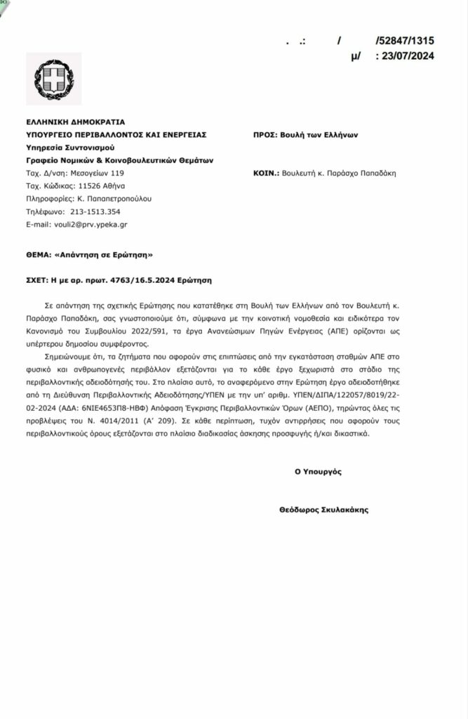 Σε απάντηση της σχετικής ερώτησης που κατατέθηκε στη Βουλή των Ελλήνων από τον βουλευτή Παράσχο Παπαδάκη σας γνωστοποιούμε, ότι σύμφωνα με την κοινοτική νομοθεσία και ειδικότερα τον κανονισμό του συμβουλίου, τα έργα ανανεώσιμων πηγών ενέργειας ορίζονται, ως υπέρμετρου δημοσίου συμφέροντος.