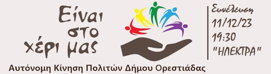 Η Αυτόνομη Κίνηση Πολιτών δήμου Ορεστιάδας “ΕΙΝΑΙ ΣΤΟ ΧΕΡΙ ΜΑΣ” καλεί τους πολίτες σε ανοιχτή συνέλευση τη Δευτέρα 11/12/2023 στις 19:30 στην αίθουσα εκδηλώσεων του ξενοδοχείου “ΗΛΕΚΤΡΑ”.