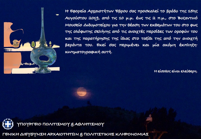Η Εφορεία Αρχαιοτήτων Έβρου ανακοινώνει ότι πέραν της κύριας εκδήλωσης που θα λάβει χώρα στον αρχαιολογικό χώρο της αρχαίας Ζώνης ΑΛεξανδρούπολης, το Βυζαντινό Μουσείο Διδυμοτείχου θα είναι ανοιχτό το βράδυ της Πέμπτης 15 Αυγούστου 2019 από τις 10μ.μ. έως τις 2 π.μ.