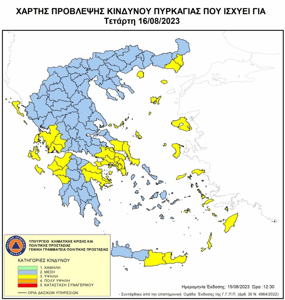 Για σήμερα, Τετάρτη 16 Αυγούστου, προβλέπεται υψηλός κίνδυνος πυρκαγιάς (κατηγορία κινδύνου 3 – σημειώνεται με κίτρινο χρώμα) στο κεντρικό και νότιο τμήμα του Έβρου αλλά και στο νησί της Σαμοθράκης.