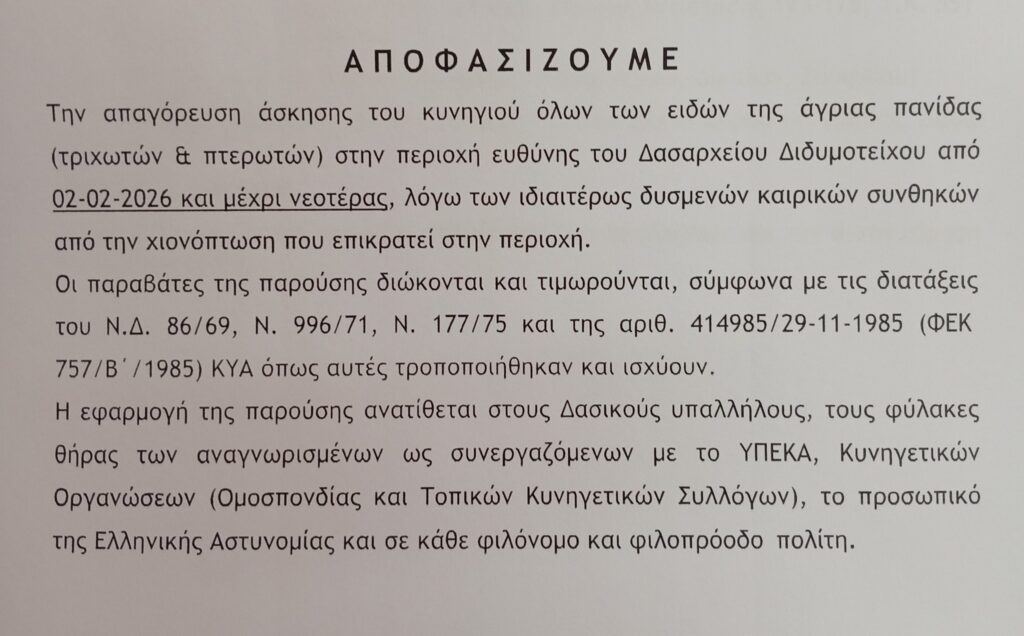 Απαγόρευση άσκησης του κυνηγιού όλων των ειδών της άγριας πανίδας (τριχωτών & πτερωτών) στην περιοχή ευθύνης του Δασαρχείου Διδυμοτείχου από 02-02-2026 και μέχρι νεοτέρας, λόγω των ιδιαιτέρως δυσμενών καιρικών συνθηκών από την χιονόπτωση που επικρατεί στην περιοχή.