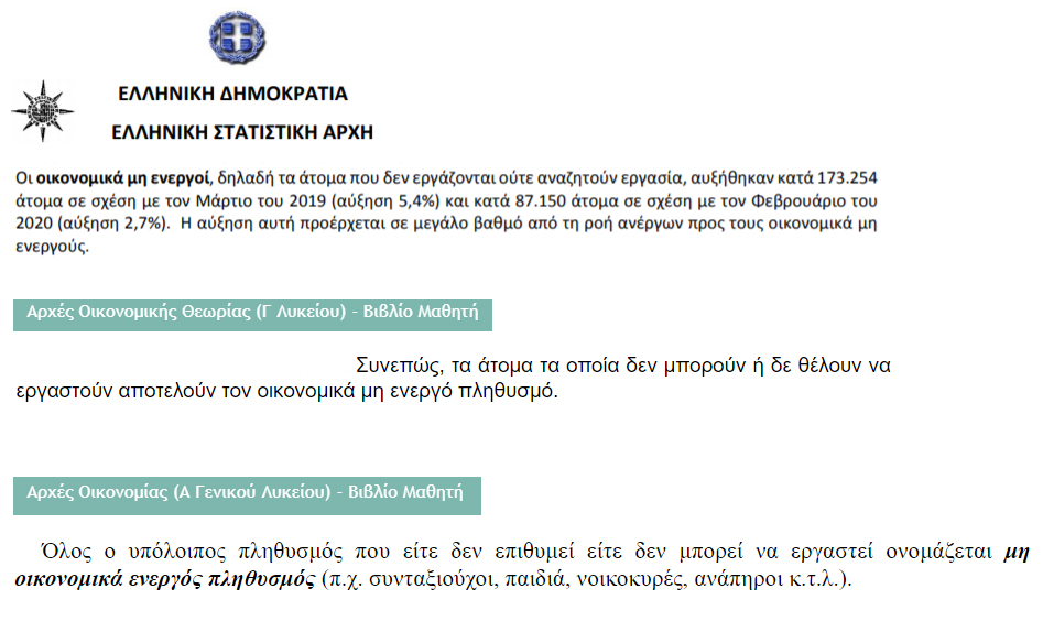 Συγκεκριμένα η συζήτηση αφορούσε τα στοιχεία που δημοσίευσε η ΕΛΣΤΑΤ την 11/6/2020 σύμφωνα με τα οποία το ποσοστό της ανεργίας μειώθηκε τον Μάρτιο του 2020 σε σχέση με τον ίδιο μήνα του 2019 κατά 3,7%, ενώ ταυτόχρονα αυξήθηκε ο αριθμός του μη ενεργού οικονομικά πληθυσμού. Σε ερώτηση ποιος είναι ο πληθυσμός αυτός, απάντησα αυτό που και η ΕΛΣΤΑΤ αναφέρει αλλά αναφέρεται και σε όλα τα εγχειρίδια Πολιτικής Οικονομίας, ότι είναι «οι οικονομικά μη ενεργοί δηλαδή τα άτομα που δεν εργάζονται ούτε αναζητούν εργασία». Είπα συγκεκριμένα «…είναι ο πληθυσμός ο οποίος δεν ασχολείται με κάτι επαγγελματικά, να παράγει κάτι, αλλά προφανώς δεν ενδιαφέρεται… Είναι κάποιοι οι οποίοι παραμένουν άνεργοι, δεν είναι καν εγγεγραμμένοι στον ΟΑΕΔ, έχουν κάποιους τρόπους επιβίωσης και δεν επιζητούν να καταγραφούν ως άνεργοι, ούτε να βρουν δουλειά».