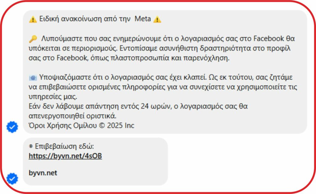 Το μήνυμα, το οποίο κυκλοφορεί μαζικά, ξεκινά με προειδοποιητικό τόνο και σύμβολα συναγερμού, αναφέροντας ότι ο λογαριασμός του χρήστη «υπόκειται σε περιορισμούς» λόγω… «ασυνήθιστης δραστηριότητας», όπως δήθεν πλαστοπροσωπία ή παρενόχληση. Στη συνέχεια, καλεί τον παραλήπτη να «επιβεβαιώσει ορισμένες πληροφορίες» εντός 24 ωρών, διαφορετικά ο λογαριασμός του θα «απενεργοποιηθεί οριστικά».