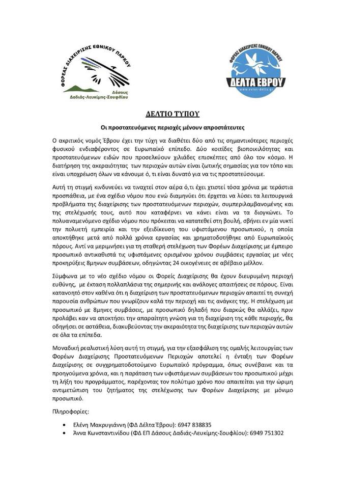 Κοινό δελτίο τύπου εξέδωσαν και οι δύο Φορείς Διαχείρισης προστατευόμενων περιοχών του Έβρου: