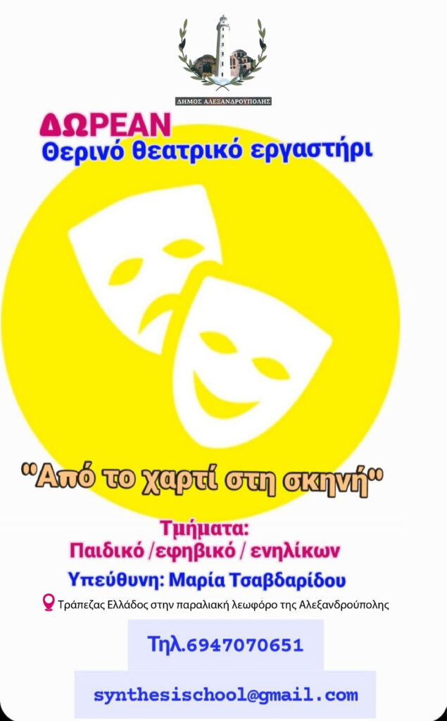 Ο Δήμος Αλεξανδρούπολης σε συνεργασία με τη συγγραφέα, θεατρολόγο και μουσικοπαιδαγωγό Μαρία Τσαβδαρίδου, διοργανώνει το 1ο θερινό θεατρικό εργαστήρι με δωρεάν συμμετοχή, για παιδιά και ενήλικες.