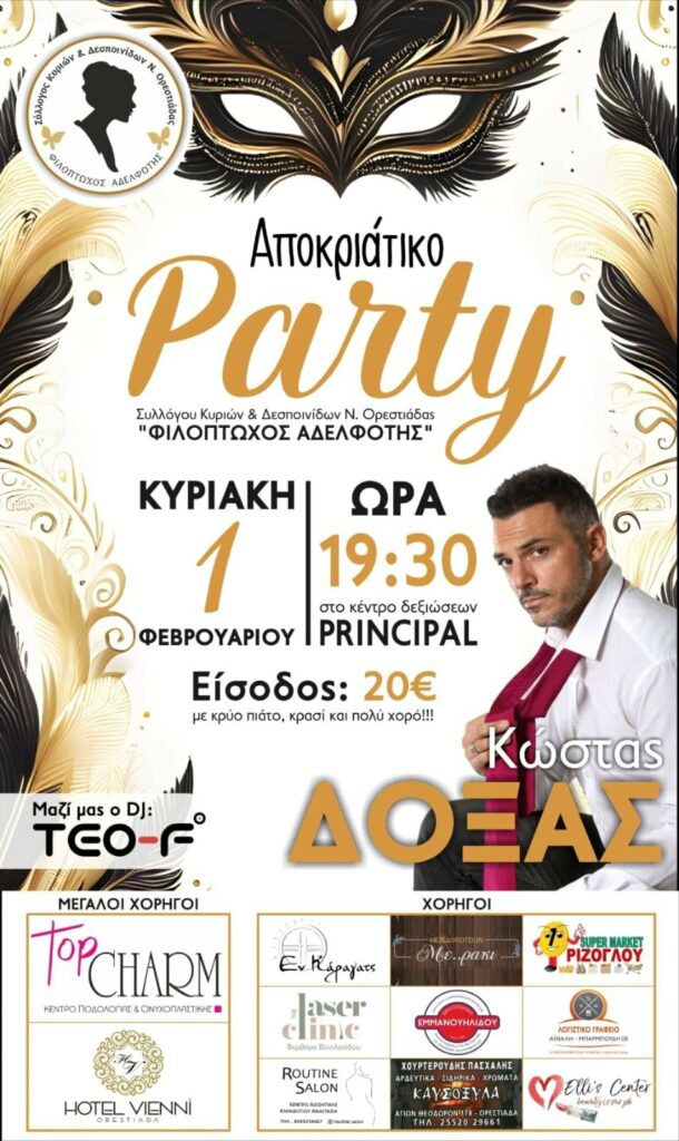 Την Κυριακή 1η Φεβρουαρίου 2026, στις 7:30 το απόγευμα, ο θεσμοθετημένος χορός που ανοίγει το Τριώδιο μεταφέρεται φέτος στο Principal, έναν χώρο που μπορεί να φιλοξενήσει πολύ κόσμο και… πολλή διάθεση για διασκέδαση. Η πρόσκληση, αξίας 20 ευρώ, περιλαμβάνει κρύο πιάτο, κρασί και χορό, με τον DJ Teo-F από νωρίς και καλεσμένο καλλιτέχνη τον Κώστα Δόξα.