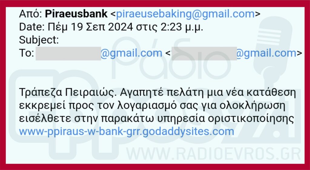 Ο επαγγελματίας ακολούθησε τις οδηγίες της τηλεφωνικά και διαδικτυακά με το μέιλ που του έστειλε (εικόνα) και αντιλήφθηκε την απάτη όταν του τηλεφώνησαν από την Τράπεζα για επιβεβαίωση μεταφοράς ποσού που επιχείρησε να κάνει η επιτήδεια.