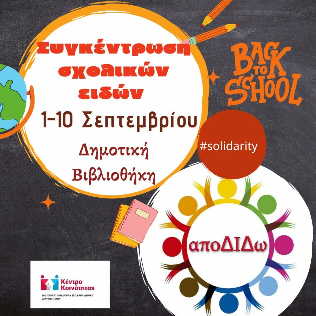 Η Εθελοντική ομάδα Διδυμοτείχου «αποΔΙΔω» ξεκινά από σήμερα, 1η Σεπτεμβρίου, συγκέντρωση σχολικών ειδών στην Δημοτική Βιβλιοθήκη Διδυμοτείχου: