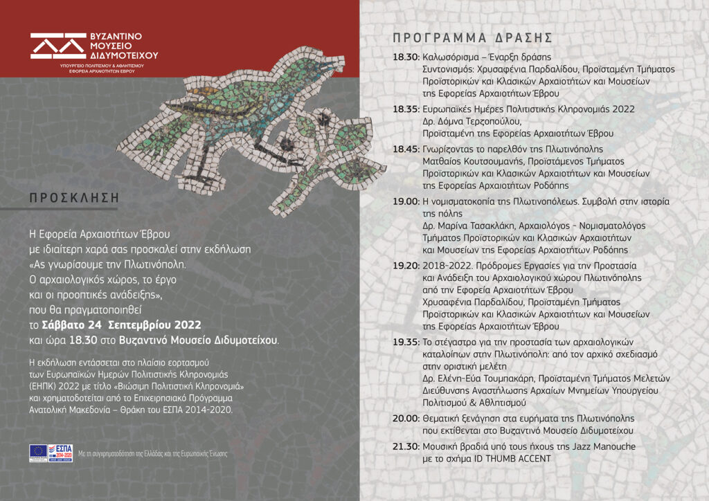 Με αφορμή τις Ευρωπαϊκές Ημέρες Πολιτιστικής Κληρονομιάς 2022, η Εφορεία Αρχαιοτήτων Έβρου διοργανώνει στο Βυζαντινό Μουσείο Διδυμοτείχου την εκδήλωση «Ας γνωρίσουμε την Πλωτινόπολη. Ο αρχαιολογικός χώρος, το έργο και οι προοπτικές ανάδειξης».