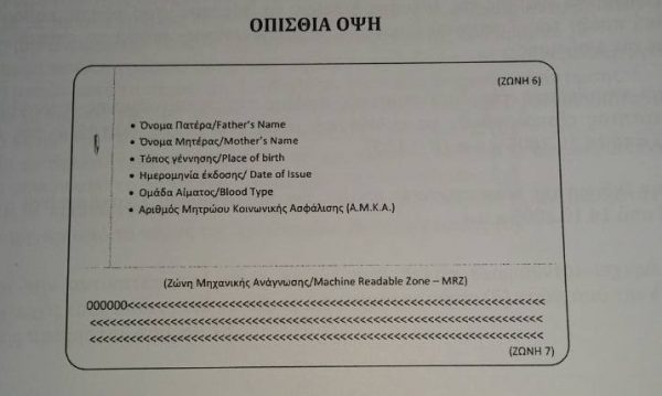 - Ζώνη 6: Όνομα Πατέρα, Όνομα Μητέρας, Τόπος γέννησης, Ημερομηνία έκδοσης, Ομάδα Αίματος, Αριθμός Μητρώου Κοινωνικής Ασφάλισης (Α.Μ.Κ.Α.), ψηφιακό δακτυλικό αποτύπωμα