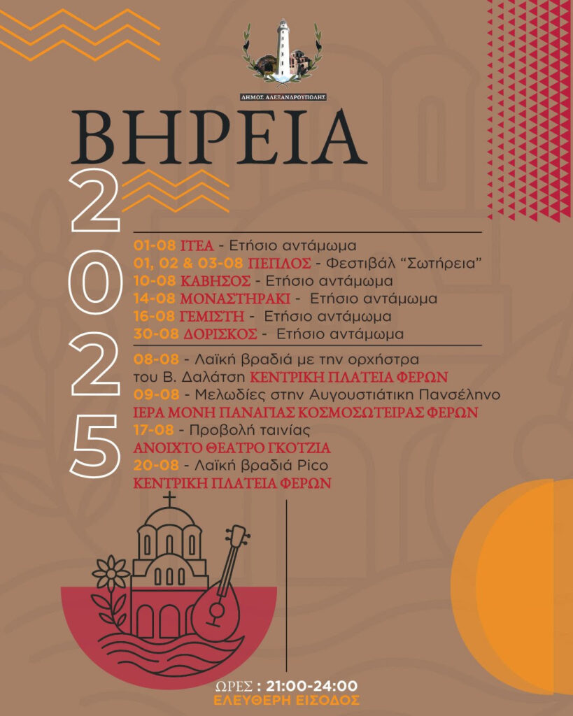 Αύγουστος στον Δήμο Αλεξανδρούπολης σημαίνει… ΒΗΡΕΙΑ 2025! Γιορτές, αντάμωματα και μουσικές βραδιές σε όλη την περιοχή!