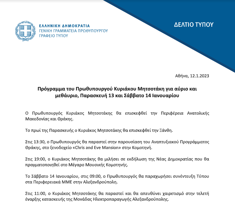 Πριν λίγα λεπτά ανακοινώθηκε και επίσημα το πρόγραμμα του Πρωθυπουργού με το παρακάτω Δελτίο Τύπου: