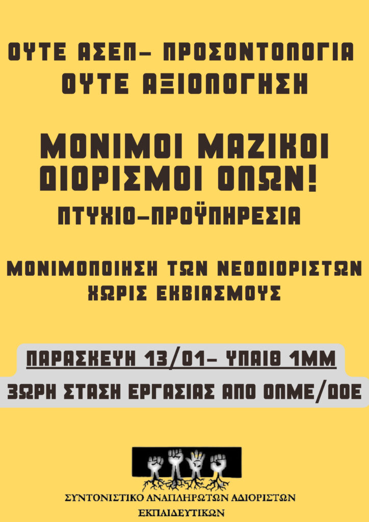 - Μόνιμη και σταθερή δουλειά για όλες/όλους! Μαζικοί μόνιμοι διορισμοί/Μονιμοποίηση ΟΛΩΝ των αναπληρωτ(ρι)ών αποκλειστικά με το πτυχίο και ολόκληρη την προϋπηρεσία! Κατάργηση του ν.4589/19 (προσοντολόγιο Γαβρόγλου). Κατάργηση κάθε μορφής ελαστικής εργασίας στο δημόσιο σχολείο. Όχι στον γραπτό ΑΣΕΠ, συνέντευξη και κάθε είδους φίλτρου για το δικαίωμα στην εργασία.