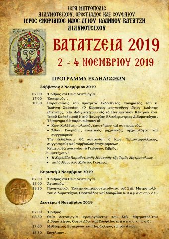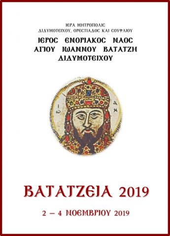 Η Ιερά Μητρόπολη Διδυμοτείχου, Ορεστιάδος και Σουφλίου – Ενοριακός ναός Αγίου Ιωάννη Βατάτζη διοργανώνει θρησκευτικές και πολιτιστικές εκδηλώσεις με θέμα: “Βατάτζεια 2019”.
